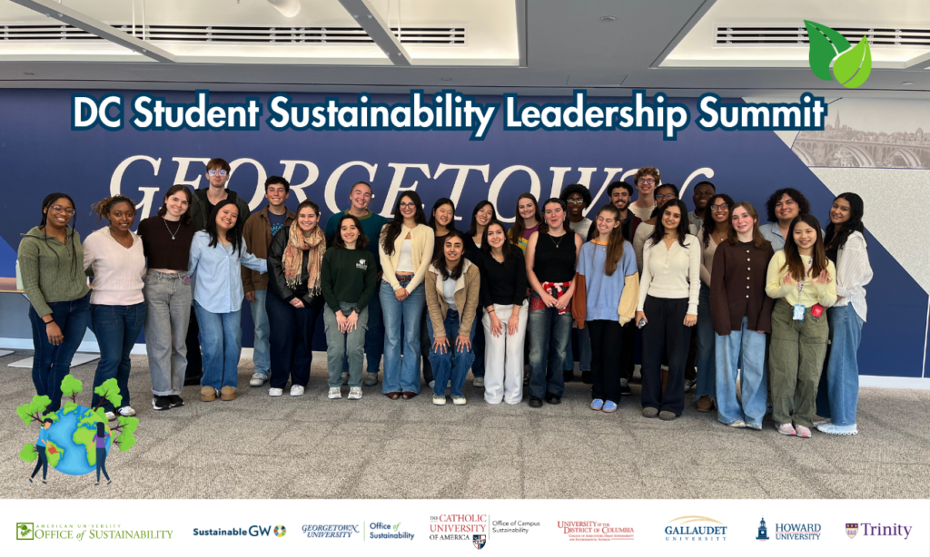 The DC Student Sustainability Leadership Summit was created through a collaboration among American, George Washington, and Georgetown Universities, all members of the DC College & University Sustainability Pledge (DC CUSP). Through the powerful collaboration of these universities and colleges that exist within the District, the DC Student Sustainability Leadership Summit was born in Spring 2024. This biannual summit takes place once a semester at a different college or university in the District. The summit aims to bring together DC students who are interested and passionate about sustainability to network, share information, and fellowship with one another.